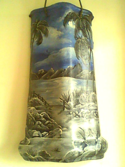 Telha pintada com tinta óleo, com amarril em corda de algodão pintada,